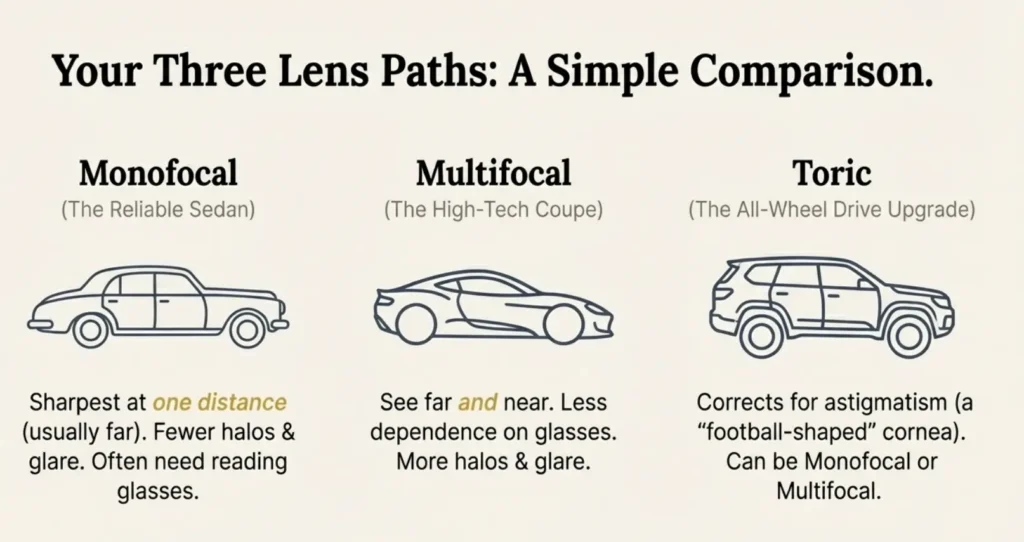 Simple rule of thumb: monofocal = simplest/cheapest; multifocal = more freedom from glasses; toric = better if the cornea has moderate astigmatism.